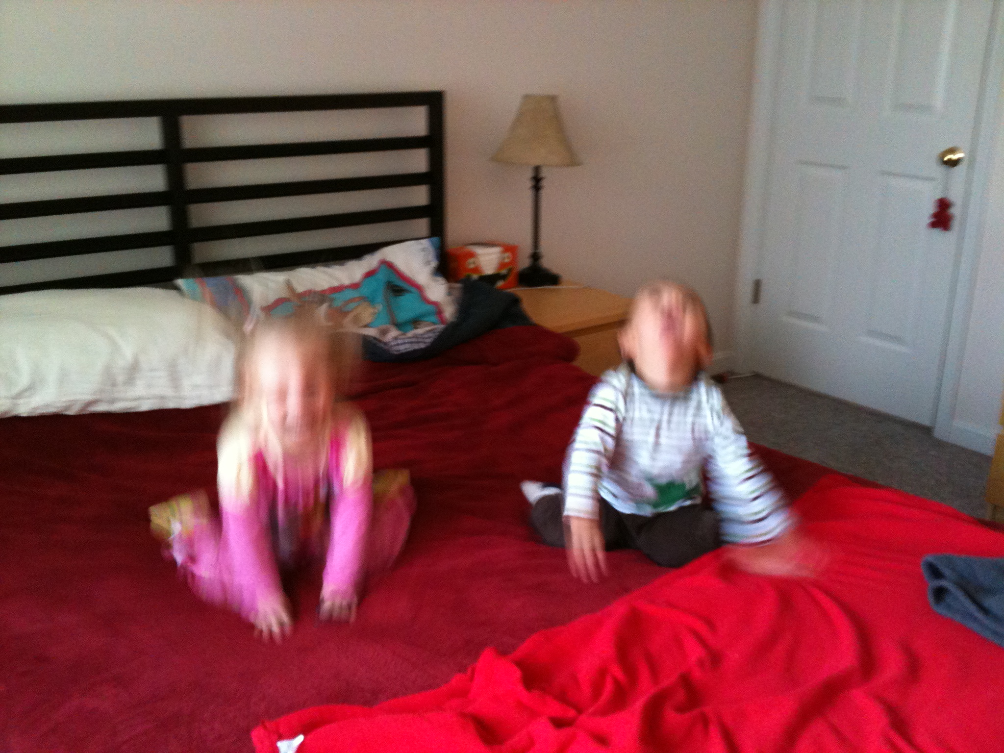 Our children love to bounce on Mommy and Daddy’s bed. It is cute as each night when Josh gets home from work they know that Daddy gets changed which means Mommy and Daddy’s bedroom which means it is time to bounce! Upon occasion I do take them into our bedroom during the day to have a good bounce. Here are a few pictures of their bouncing!