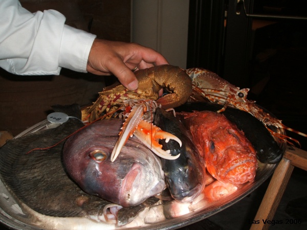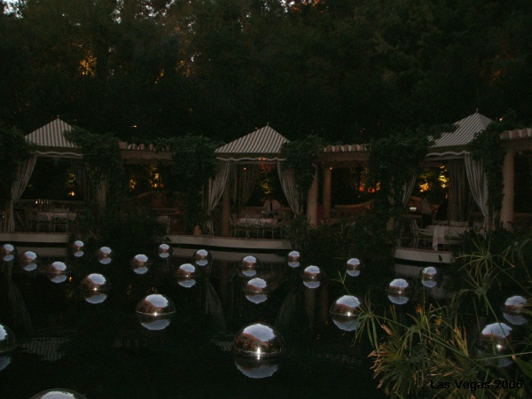 That night we had a evening at The Wynn, the newest hotel on the strip. This hotel cost 3 billion dollars to build. We had 7:30pm dinner reservations, but being that we made such impeccable time, not having to stand around and wait for a cab nor having to take that time to hand over another $20, we had a cocktail at a lounge on the casino floor. We then made our way to Bartolottas for dinner. Arriving a few minutes before 7:30 we planned on getting a second cocktail at the bar of the restaurant, the hostess however said she could seat us. We asked if there was any outside seating available, for when we made the reservation online, the outside part of this restaurant is one of the reasons we wanted to eat there. Seated right next to the 1/2 moon pond, we were greeted by a school of koi. It was so funny that they all swam over to us as we sat down at our table. The unique thing about the pond is it had silver balls, yes silver balls floating on the top of the water. When the light hit the balls just right they really sparkled and provided us with a perfect atmosphere. After our drink order was taken the second of our two wait staff arrived at our table with an arrangement of fresh fish, one of the fish was actually still alive and was bouncing around on the plate as the waiter was giving his demonstration. We found it very odd that at this Italian restaurant fish was such a big part of the presentation. When opening our menus we were in for an even bigger surprise as there were 2 whole pages of Appetizers and one small section on Entrees, along with a section devoted solely to fish. Is something wrong here, we were expecting Italian!?!?! Ordering an Appetizer to share, we started to filter through the menu for something, remember Josh doesn’t care for that much fish. Josh ended up ordering a veal dish, so he was happy. Megan, decided to go with fish. Taking our order our waiter informed Megan that fish is only prepared for two, so she ends up going with an Appetizer. You could take any Appetizer and turn it into an Entree. In the end our dinner was really good, we were just expecting Italian and ended up at a Fish served for Two restaurant, not really our thing.