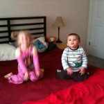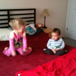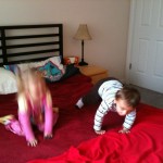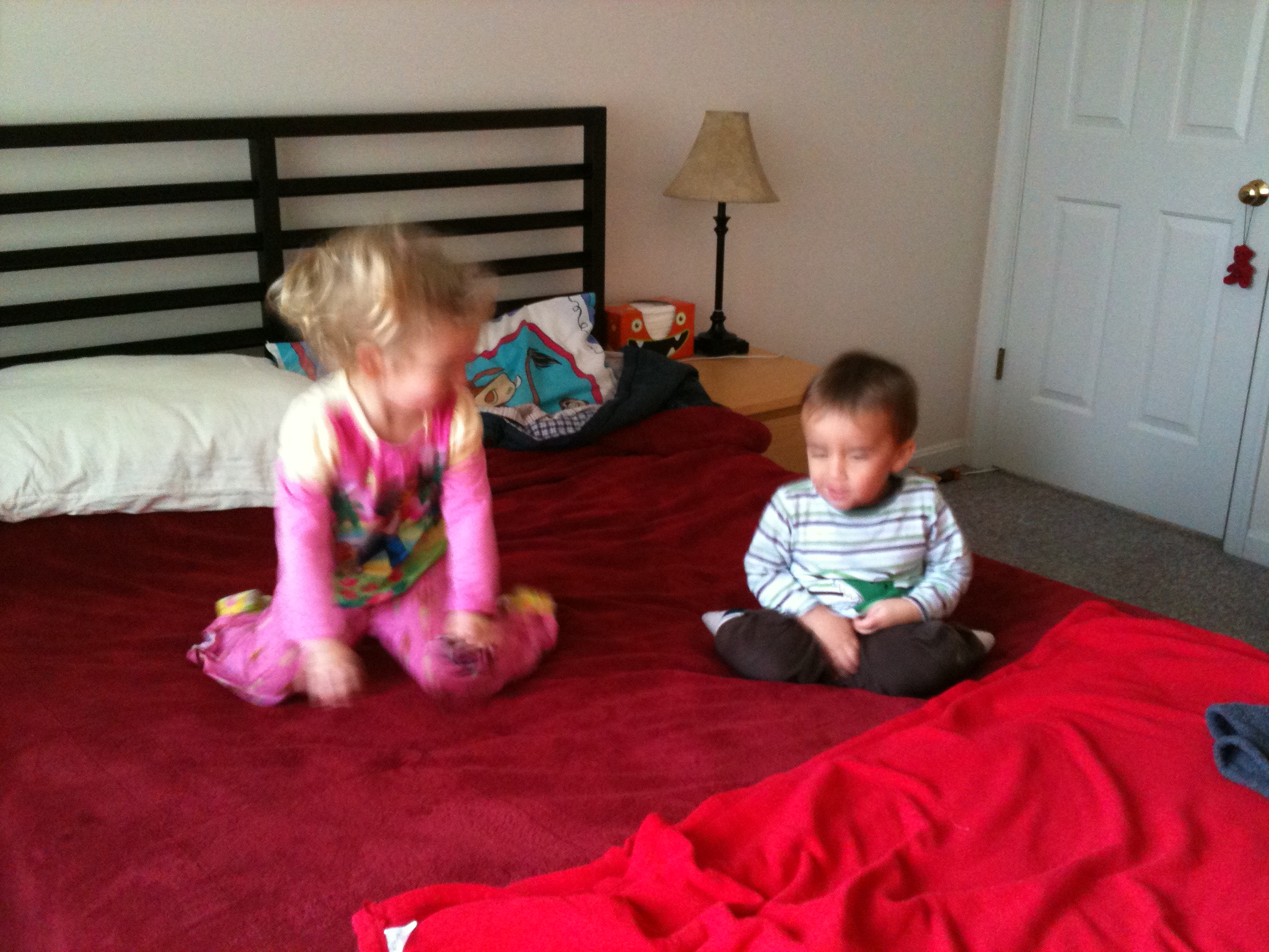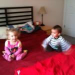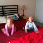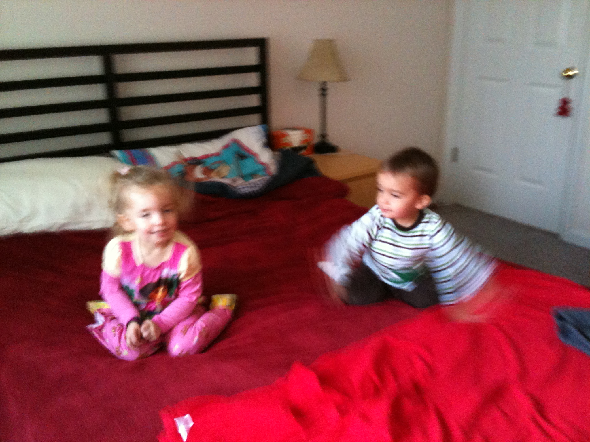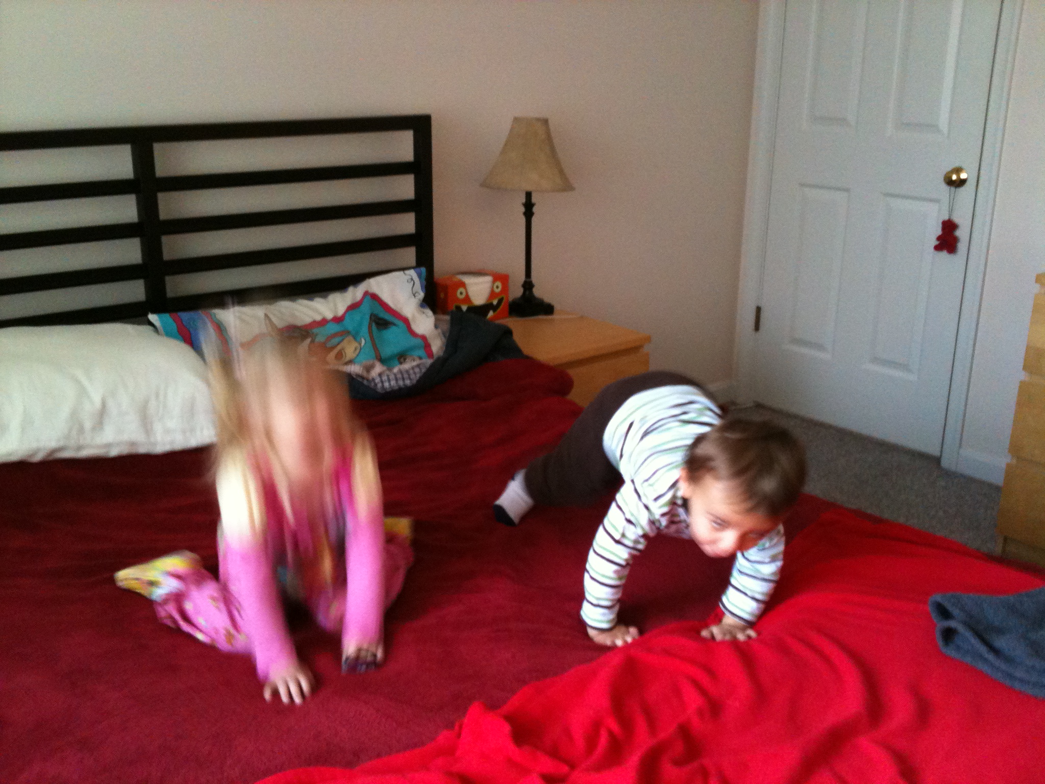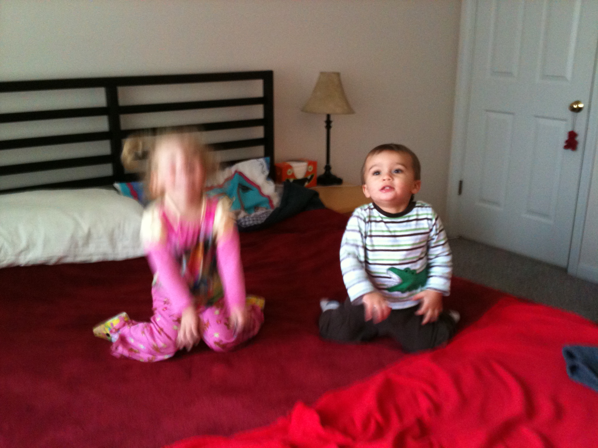Our children love to bounce on Mommy and Daddy’s bed. It is cute as each night when Josh gets home from work they know that Daddy gets changed which means Mommy and Daddy’s bedroom which means it is time to bounce! Upon occasion I do take them into our bedroom during the day to have a good bounce. Here are a few pictures of their bouncing!
